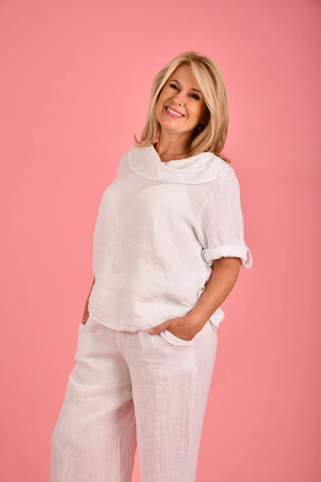 Made of high-quality linen, the LUCCA COWL NECK TOP combines boldness and elegance. Add a statement to your outfit.